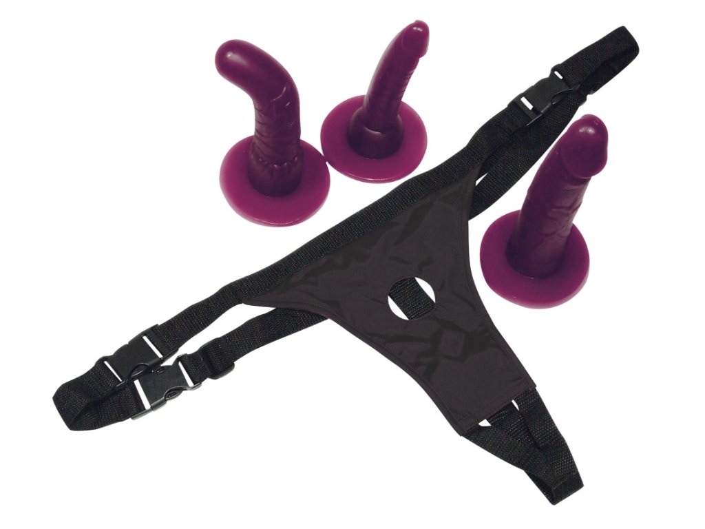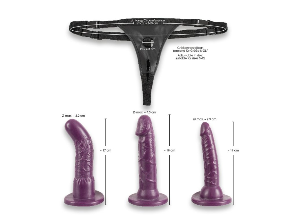 Tento Strap-On Set obsahuje 3 vyměnitelné dildy pro různorodou stimulaci – klasický penisový tvar, štíhlý anální a anatomicky zakřivený G/P-bodový.