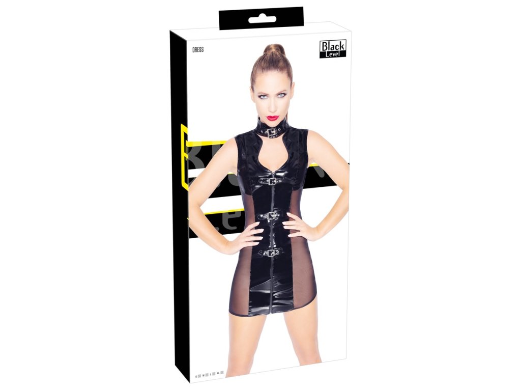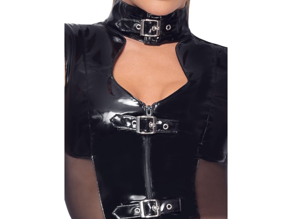 Na přední straně šatů se nachází plně funkční zip pod třemi kovovými přezkami, který dovoluje hrát si s odhalením i fantazií. Stojací límec s přezkami působí dominantně a vytváří sexy bondage vzhled, který okamžitě zaujme.