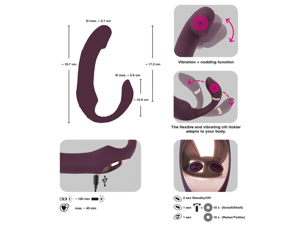 Každé zakončení nabízí 10 vibračních režimů, které lze ovládat samostatně – pro individuální zážitek podle nálady. Výkonný motor zaručuje hluboké vibrace, které zasáhnou přesně tam, kde mají.