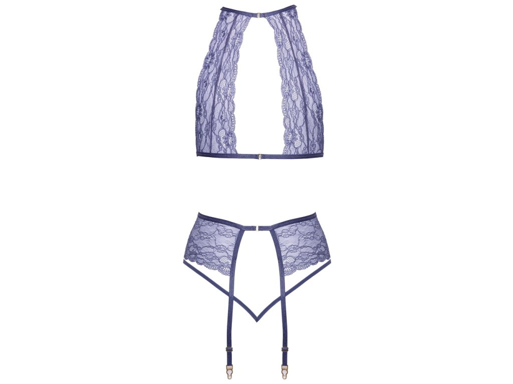 Jemná levandulová krajka působí něžně a elegantně, podvazky dodávají smyslný akcent.