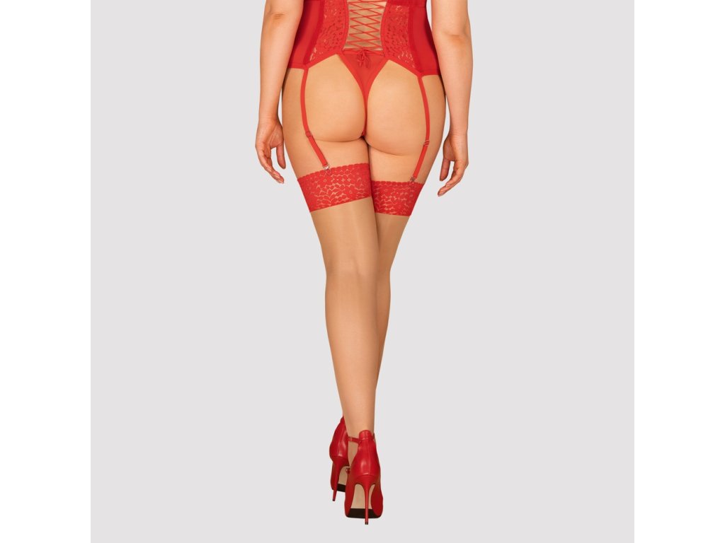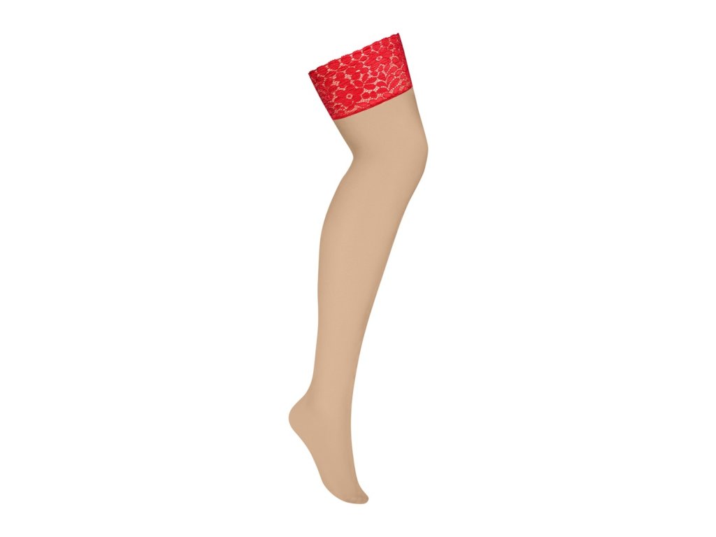 Nechte své nohy zazářit v ikonickém stylu! Obsessive Blossmina přináší nude punčochy s výrazným červeným krajkovým lemem, které působí elegantně, svůdně a dokonale ženskě. Jemný materiál se hedvábně přizpůsobí pokožce a zajistí luxusní pocit při každém doteku.
