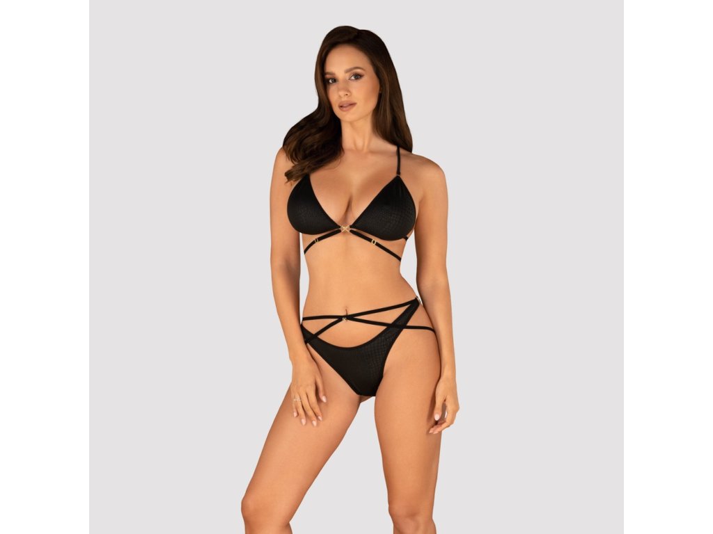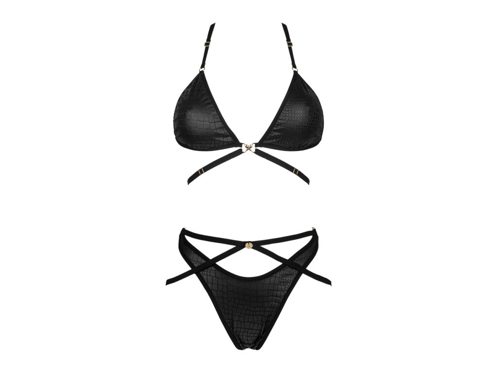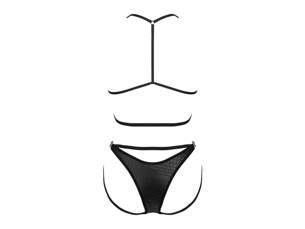 Dopřejte si odvážný a svůdný vzhled s černým setem Cobra Nive od značky Obsessive. Tento dvoudílný komplet tvoří soft podprsenka a slip, které zaujmou stylovou hadí strukturou v kombinaci s rafinovanými řemínkovými detaily a zlatými akcenty.
